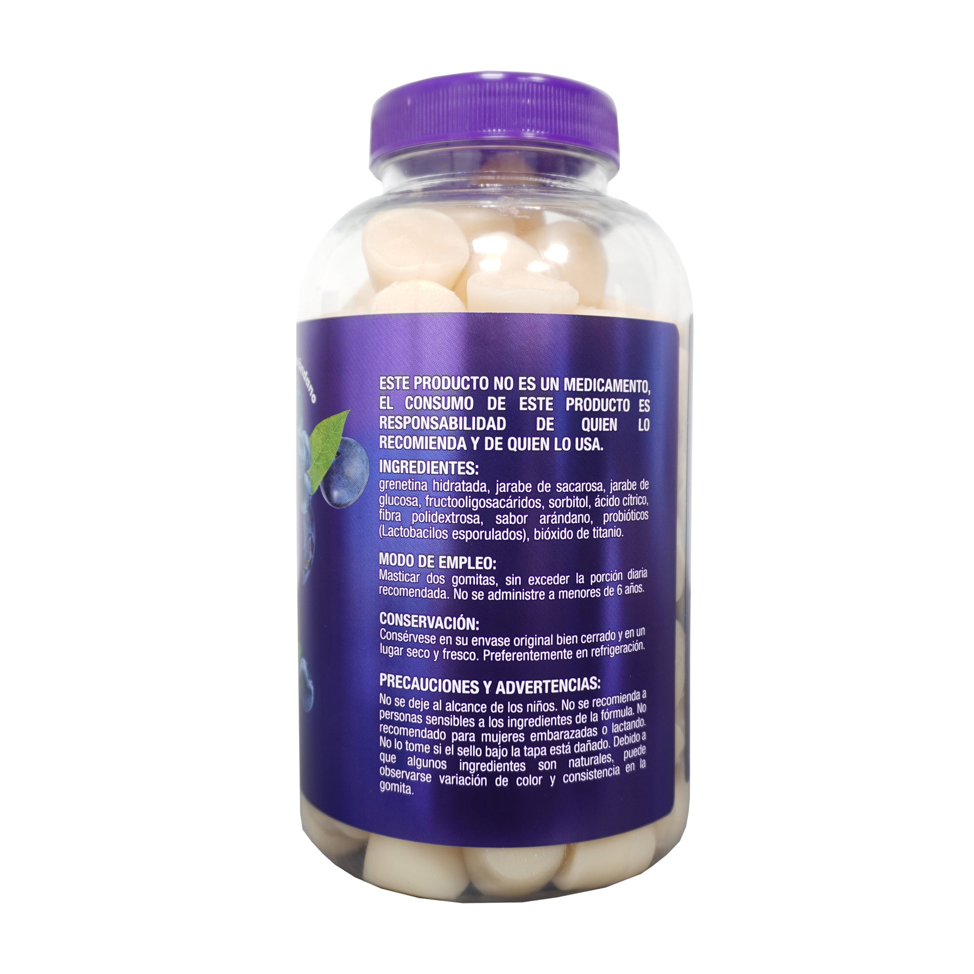 Gomitas de Probióticos + Fibra Soluble reducidas en azúcar azúcar con delicioso sabor arándano.